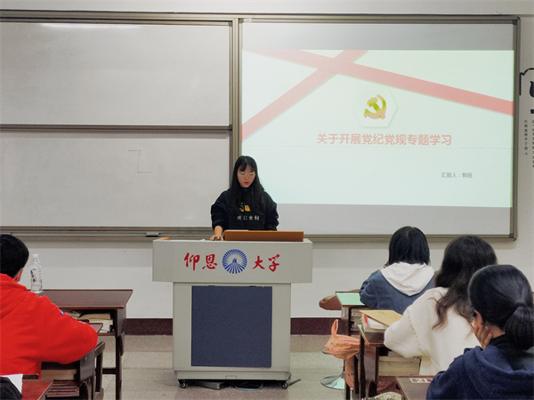 (会议现场图) 会议伊始,张玮菁指出,要自觉学习贯彻中国共产党的相关党纪党规,并与习近平总书记关于全面从严治党、加强纪律建设的重要论述相结合,与党的十八大以来管党治党理论、实践和制度创新成果相结合,与学习党章党规相结合,筑牢底线意识,强化个人约束,规范自身行为。郭瑶同志在分享中指出,作为一名党员,要严格遵守党的政治纪律、组织纪律、廉洁纪律、工作纪律和生活纪律,在思想上和行动上要始终与党中央保持高度一致,坚决落实中央的决策部署,进一步坚定理想信念,不忘初心。