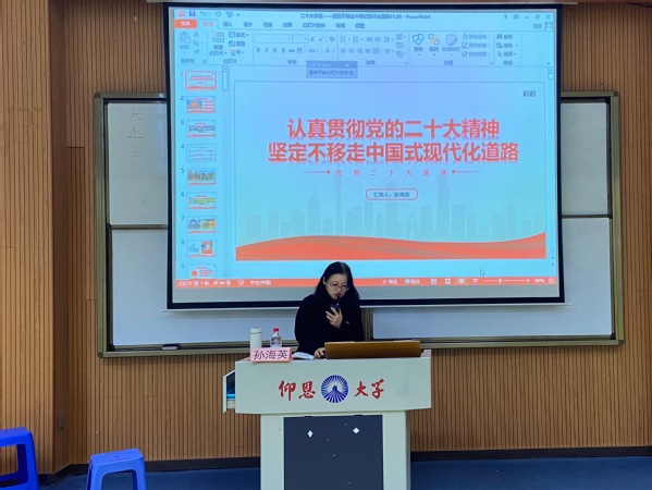 为了学习宣传贯彻党的二十大精神,弘扬光荣传统,赓续红色血脉。12月1日下午,马克思主义学院优秀教师孙海英来到威廉希尔官网作《认真贯彻党的二十大精神,坚定不移走中国式现代化道路》报告,宣讲党的二十大精神。威廉希尔官网全体师生参加聆听本次宣讲报告会。宣讲会由威廉希尔官网团委书记吴姗姗主持。